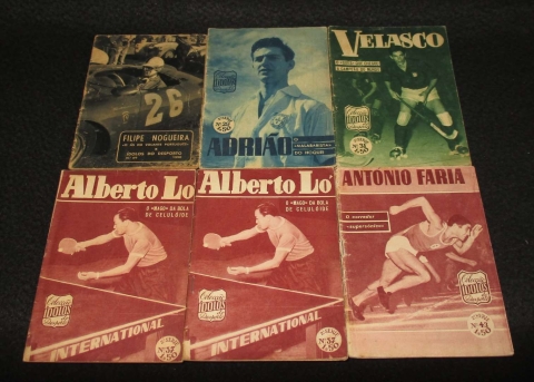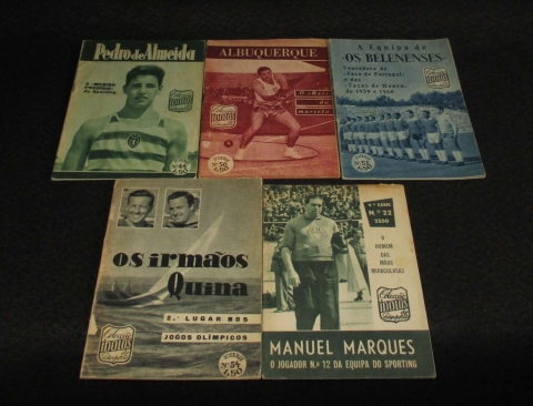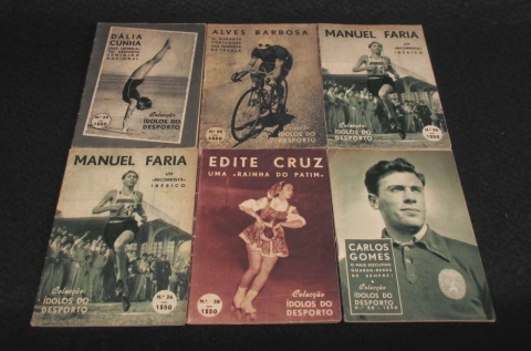 Capa de brochura. Biografias ilustradas de desportistas. A "Colecção Ídolos do Desporto", foi uma revista muito popular na década de 1950 do século XX onde se publicava semanalmente biografias profusamente ilustradas dos grandes desportistas nacionais e será uma das primeiras publicações de imprensa desportiva em Portugal que tinha por objectivo formar uma colecção com os panfletos publicados. Reuniram-se nesta colecção as biografias de vários homens e algumas mulheres que se destacaram no futebol, patinagem e hóquei, entre outras modalidades desportivas. Coleccionismo Imprensa e Jornalismo.