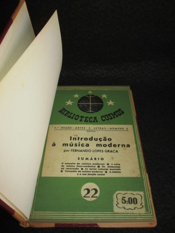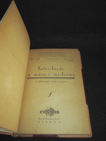 Encadernação meia francesa com lombada e cantos em pele. Ferros e títulos gravados a ouro na lombada. Preserva capa original de brochura. Ilustrado com fotografias de diversos músicos e compositores. Colecção dirigida por Bento de Jesus Caraça. “ De maneira nenhuma êste ensaio pode ser, nem pretende ser, um estudo exaustivo dos problemas que levantou, e levanta ainda, a música destas quatro primeiras décadas do século XX. (...) A finalidade essencial que presidiu à sua feitura ressalta do próprio título que leva: Introdução à Música Moderna. Quere dizer: uma exposição, tão clara e simples quanto o permite a complexidade da matéria, dos aspectos mais relevantes e característicos da grande evolução sofrida pela música nos últimos tempos, e que tanto tem desnorteado os espíritos, mesmo os mais desprevenidos (...)” — retirado de Advertência Preliminar.
