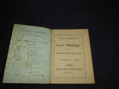 Peça de colecção. Capa de brochura manchada, miolo limpo. Lista de passageiros do Paquete Malange de África Ocidental para Lisboa Viagem nº 423.