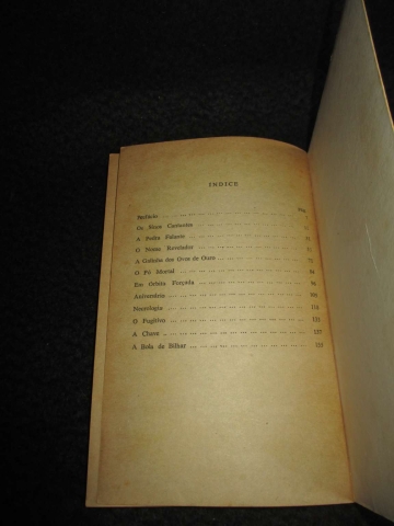 Capa de brochura. Tradução de Eduardo Saló. Inclui os seguintes contos: Os sinos cantantes; A pedra falante; O nome revelador; A galinha dos ovos de ouro; O pó mortal; Em órbita forçada; Aniversário; Necrologia; O fugitivo; A chave; A bola de bilhar.