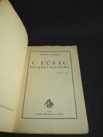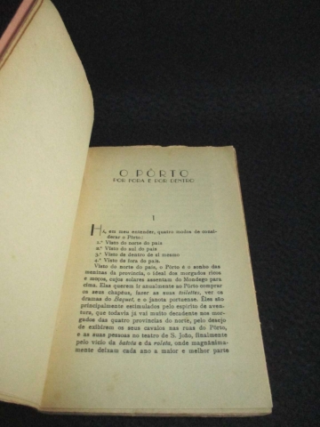 Capa de brochura. A edição O Porto por Fora e por Dentro, de Alberto Pimentel, é uma obra marcante da literatura portuense, publicada originalmente em 1878 e reeditada ao longo do século XX, onde se incluí esta edição. Trata‑se de um livro de memórias, crónica urbana e retrato social, escrito por um dos autores que melhor fixou o espírito da cidade no final do século XIX.