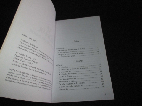 O Livro do Esplendor. Capa de brochura. O Zohar, ou Livro do Esplendor, é uma obra clássica da mística judaica e o livro mais completo sobre a Cabala. Sendo um comentário da Lei (que segue o plano dos cinco primeiros livros da Bíblia), esta obra apresenta uma colectânea de excertos seleccionados pela sua vivacidade colorida na descrição da vida espiritual, pela acuidade na exegese da Escritura, pelo carácter múltiplo do pensamento sobre a alma, a vida da fé, o amor humano e o amor divino, o sofrimento e a morte, o exílio e a redenção... Religião Judaica.
