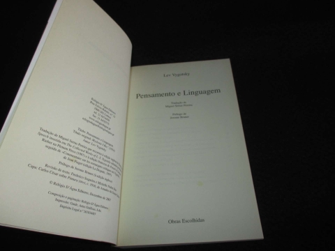 Capa de brochura. Tradução de Miguel Serras Pereira. Prólogo de Jerome Bruner. Publicado em 1934, Pensamento e Linguagem foi o último livro de Vygotsky. Momento culminante da sua obra, é nele que Vygotsky analisa, de modo original, as relações entre pensamento e linguagem, uma das questões mais candentes da psicologia.