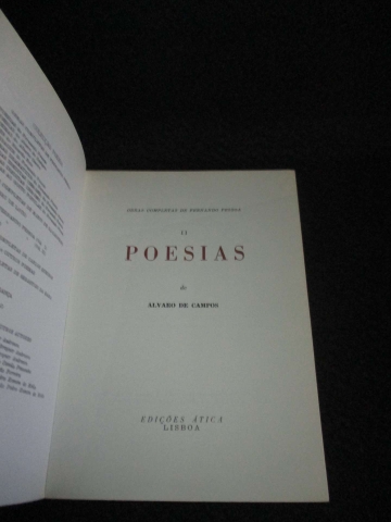 Capa de brochura. Obra integrada na coleção "Poesia" fundada por Luís de Montalvor. Desenho da capa da autoria de Almada Negreiros. “Álvaro de Campos nasceu em Tavira, no dia 15 de Outubro de 1890 (às1,30 da tarde, diz-me o Ferreira Gomes; e é verdade, pois, feito o horóscopo para essa hora, está certo). Este, como sabe, é engenheiro naval (por Glasgow), mas agora está aqui em Lisboa em inactividade (...) Como escrevo em nome desses três?... Caeiro por pura e inesperada inspiração, sem saber ou sequer calcular que iria escrever. Ricardo Reis, depois de uma deliberação abstrcta, que sùbitamente se concretiza numa ode. Campos, quando sinto um súbito impulso para escreer e não sei o quê (...)”