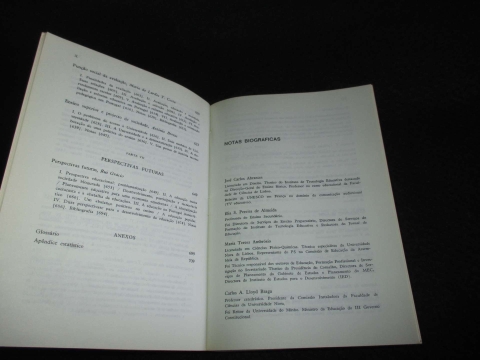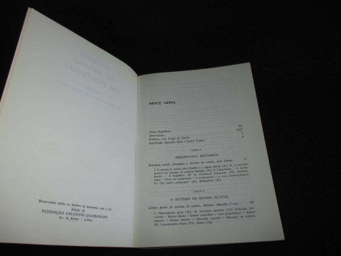 Capa de brochura. Ilustrado com mapas, 9 desdobráveis reproduzindo tabelas de dados estatísticos. Obra colectiva em que se reúnem diversos artigos consagrados ao estudo das práticas de ensino em Portugal, publicada por iniciativa de Luís Veiga da Cunha, Ministro da Educação do V Governo Constitucional. Apresenta uma estrutura tripartida: A primeira parte, de carácter histórico, analisa a estrutura social, as correntes ideológicas e o sistema de ensino português, da época das reformas pombalinas em diante; A segunda parte, densamente documentada, reúne artigos voltados para o estudo dos problemas estruturais do sistema de ensino nacional à época, discriminando os factores que condicionam e explicam a situação; Finalmente, a terceira parte, trata a problemática do futuro do ensino em Portugal numa perspectiva global, estimulando a capacidade crítica do leitor. Reúne textos de: Joel Serrão, António Almeida Costa, Aldónio Gomes, G. Câncio Martins, J. M Prostes da Fonseca, Isabel Correia, Rogério Fernandes, M. Tavares Emídio, C- Lloyd Braga, E. Marçal Grilo, J. Noronha Feio, Madalena Perdigão, Ana Maria Bénard da Costa, Alberto Melo, Maria Emília Brederode Santos, Élia Pereira de Almeida, António Caldeira Cabral, V. Quadros Martins, Maria do Carmo Matos, J. Marques da Silva, José C. Abrantes, A. Bruto da Costa, Teresa Ambrósio, Maria de Lurdes T. Costa, António Brotas e Rui Grácio. Contém apensos: um glossário dos principais termos técnicos utilizados e vários quadros de dados estatísticos.
