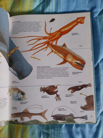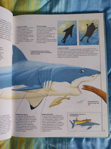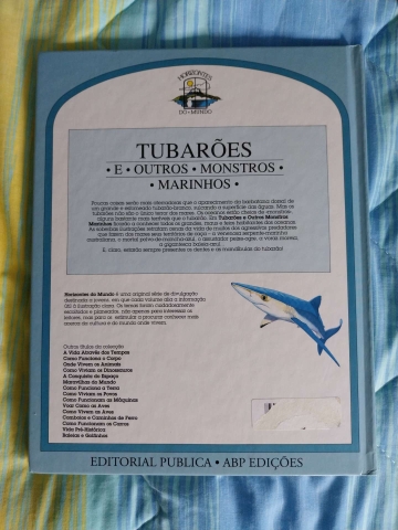 “Poucas coisas serão mais aterradoras que o aparecimento da barbatana dorsal de um grande e esfomeado tubarão-branco, sulcando a superfície das águas. Mas os tubarões não são o único terror dos mares. Os oceanos estão cheios de “monstros”, alguns bastante mais terríveis que o tubarão. Em Tubarões e Outros Monstros Marinhos ficarão a conhecer todos os grandes, maus e feios habitantes dos oceanos. As soberbas ilustrações retratam cenas da vida de muitos dos agressivos predadores que fazem dos mares seus territórios de caça - a venenosa serpente-marinha australiana, o mortal polvo-de-mancha-azul, o assustador peixe-ogre, a voraz moreia, a gigantesca baleia-azul… E, claro, estarão sempre presentes os dentes e as mandíbulas do tubarão!”