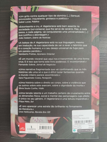 Este é um livro admirável sobre sexo e violência - erótico, comovente, incrivelmente corajoso e provocador, original e poético. Segundo Ian McEwan, «um livro sobre loucura e sexo, que merece todo o sucesso que alcançou». Na Coreia do Sul, depois do anúncio do Man Booker International Prize, A Vegetariana vendeu mais de 600 000 exemplares. Aplaudido em todos os países onde está traduzido, é um best-seller internacional."