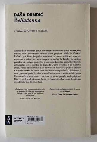 Andreas Ban, psicólogo que já não exerce e escritor que já não escreve, vive sozinho num apartamento austero numa pequena cidade da Croácia. Rodeado por livros, fotografias, resultados de exames médicos, cartas por responder e caixas por abrir, resgata memórias da família, de amigos perdidos, de antigos pacientes, e das suas histórias irremediavelmente entrançadas com a sombra da Segunda Guerra Mundial e do nazismo croata. Vendo-se definhar às mãos da velhice e da doença, apenas o cinismo e a ironia servem de armas a um intelectual marginalizado. Belladonna é uma poderosa parábola sobre o envelhecimento e a enfermidade numa Europa onde as atrocidades cometidas no século passado ainda palpitam. Pois, como defende Andreas Ban, é precisamente sobre coisas de que não se pode falar que devemos falar.
