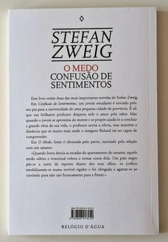 Este livro reúne duas das mais importantes novelas de Stefan Zweig. Em Confusão de Sentimentos, um jovem estudante é enviado pelo seu pai para a universidade de uma pequena cidade da província. É ali que um brilhante professor desperta nele o amor pelo saber. Em O Medo, Irene é obcecada pelo pavor, suscitado pela relação com um amante.
