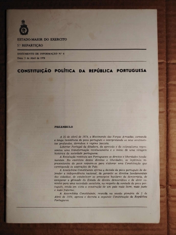 Constituição Política da República Portuguesa - Documento de Informação N.º6 da 5.ª Repartição do Estado-Maior do Exército publicado a 3 de abril de 1976, um dia depois da Assembleia Constituinte aprovar e decretar a Constituição da República Portuguesa.