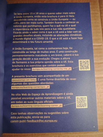 Nesta brochura descobrirás como se construiu a União Europeia.Também ficarás a conhecer os valores que partilhamos, quem faz o quê na UE e qual a importância de tudo isto para a tua vida quotidiana. Ficarás ainda a saber como é que a UE está a lidar com os grandes desafios atuais, incluindo as alterações climáticas, o mundo digital e a COVID-19. O que a UE está a fazer hoje determinará o teu futuro amanhã.