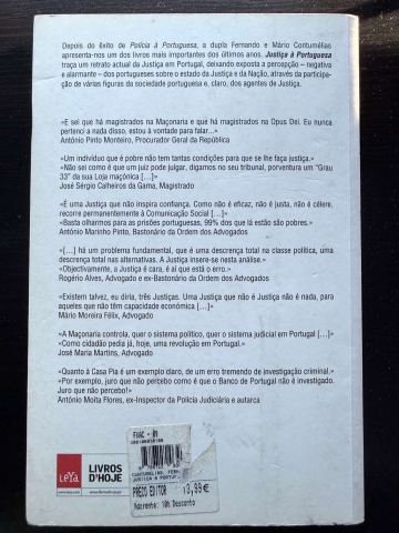 "Depois do êxito de Polícia à Portuguesa, a dupla Fernando e Mário Contumélias apresenta-nos um dos livros mais importantes dos últimos anos. Justiça à Portuguesa traça um retrato actual da Justiça em Portugal, deixando exposta a percepção - negativa e alarmante - dos portugueses sobre o estado da Justiça e da Nação, através da participação de várias figuras da sociedade portuguesa e, claro, dos agentes de Justiça.