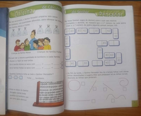Adição e subtração, incluindo o uso de materiais concretos como o material dourado ou objetos simples.
