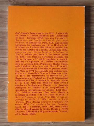 José-Augusto França (n. 1922) catedrático jubilado da Universidade Nova de Lisboa, membro da Academia das Ciências e antigo presidente da Academia Nacional de Belas Artes (1976-79) e do Instituto de Cultura e Língua Portuguesa (1976-80), membro honorário do Comité Internacional d’Histoire de l’Art e da Ordem dos Arquitectos, antigo membro do Comité du Patrimoine Mondial (UNESCO). É autor de numerosas obras sobre história e sociologia da cultura e da arte portuguesas desde 1956, e de obras de ficção literária desde 1949. Em 1967-1970, o Professor José-Augusto França foi responsável pela classificação da área histórica de Lisboa a preservar, e em 1992 foi-lhe atribuída a Medalha de Honra da Cidade.