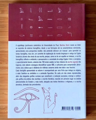 Hieróglifos: 580 sinais para compreender o Antigo Egipto é um livro ideal para quem procura compreender os hieróglifos egípcios, a escrita do Antigo Egipto e o imaginário do Egipto faraónico sem ter de recorrer a manuais excessivamente técnicos. Marilina Betrò – egiptóloga e professora da Universidade de Pisa – oferece aqui uma abordagem clara, culta e muito sedutora a um dos sistemas de escrita mais fascinantes da História.
