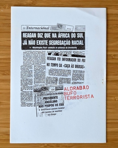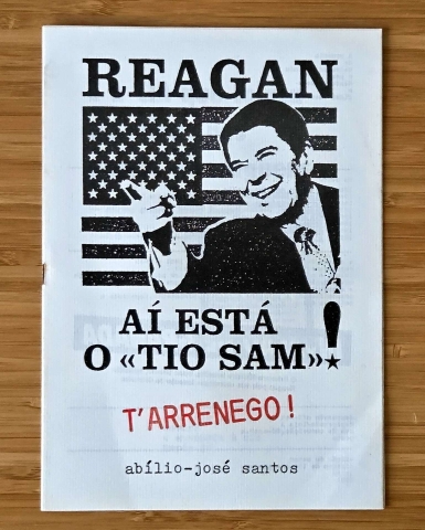 Reagan: Aí está o “tio Sam”! T’arrenego! é um panfleto visual e político em que Abílio-José Santos transforma a página em manifesto satírico: recortes, colagens, fraseado de choque e humor corrosivo contra o imaginário do poder norte-americano (Reagan e o “tio Sam”).