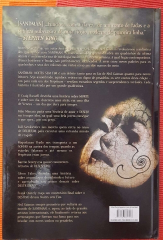 Antes de se tornar um autor best-seller do New York Times, Neil Gaiman revolucionou a indústria dos quadrinhos com SANDMAN. A mais aclamada e premiada obra em quadrinhos da última década é uma mescla rica de mitologia moderna e fantasia sombria, à qual ficção contemporânea, drama histórico e lendas são perfeitamente intrincados. A série criou novos padrões para os quadrinhos e seus dez volumes são vistos como um dos marcos do meio. Sandman. Noites sem Fim é um deleite tanto para os fãs de Neil Gaiman quanto para novos leitores. Seja assombrado, agridoce, erótico ou digno de pesadelos, os sete contos desta edição - um para cada um dos Perpétuos - revelam estranhos segredos e surpreendentes verdades. Cada história é ilustrada por um grande quadrinista: P. Craig Russell, Milo Manara, Bill Sienkiewicz, Miguelanxo Prado, Barron Storey, Glenn Fabry e Frank Quitely formam essa seleção de artistas! Neil Gaiman sempre prometeu que voltaria ao mundo de Sandman, e, agora, ao lado de grandes artistas internacionais, ele finalmente retorna aos personagens que fizeram sua fama para nos brindar com novos sonhos ou pesadelos.