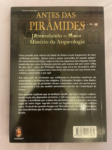 Uma jornada pela ciência da Idade da Pedra revela fragmentos de uma civilização perdida. Quem criou a maior maravilha do mundo antigo? Os construtores do Egito, como revela essa espantosa investigação, foram inspirados por uma civilização anterior, pelo menos mil anos mais velha do que eles? Antes das Pirâmides lança uma nova luz dramática sobre como os imensos monumentos funerários dos faraós em Gizé foram concebidos, construídos e por quê. Em uma série de revelações que estilhaçam as doutrinas modernas da arqueologia e da história das religiões, Christopher Knight e Alan Butler demonstram que as pirâmides foram construídas como um portal para o firmamento e em um modelo astronômico preciso da Constelação de Órion. Eles também explicam que as medições usadas em Gizé exigiam conhecimento exato das dimensões terrestres, 2 mil anos antes de elas serem calculadas, e acreditam que o plano das pirâmides não é original, e sim uma cópia de outro lugar sagrado criado na Inglaterra mais de um milênio antes. No local dos grandes henges em Thornborough, em North Yorkshire, eles descobriram que lá surgiu o modelo das pirâmides, muito antes dos faraós.