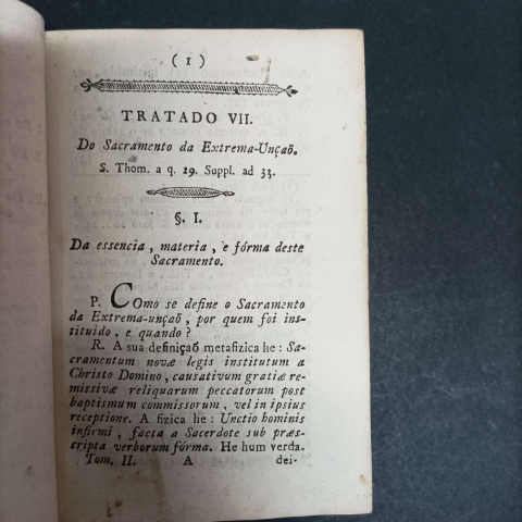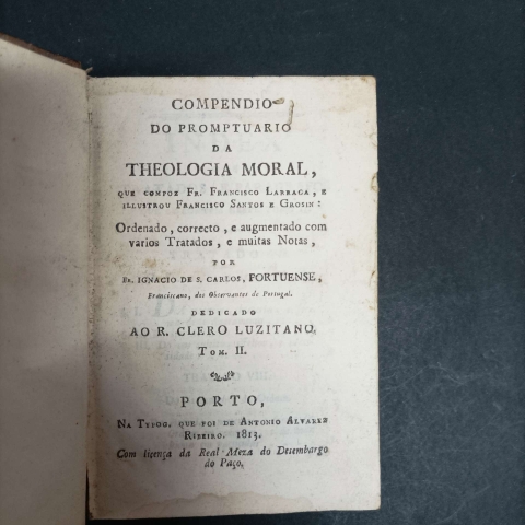 «Que compoz Fr. Francisco Larraga, e illustrou Francisco Santos Grosin: Ordenado, correcto, e augmentado, com varios Tratados, e muitas Notas, por Fr. Ignacio de S. Carlos, Portuense, Franciscano, dos Observantes de Portugal. Dedicado ao R. Clero Luzitano». Exemplares em óptimo estado com encadernação inteira de pele da época.