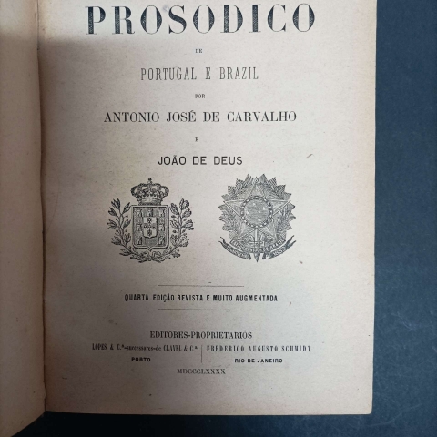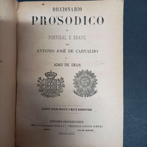 O Diccionario Prosodico de Portugal e Brazil foi organizado por Antonio José de Carvalho e João de Deus e publicado pela Lopes & C.a - successores de Clavel & C.a. Este exemplar, pertencente à 5ª edição, foi publicado no Porto em 1895. O dicionário é direcionado “a todos os que desejam falar sem erros de pronúncia, tão vulgares entre as pessoas ainda razoavelmente instruídas” e “ao público em geral e em especial aos que estudam nas escolas a língua portuguesa”. Após a apresentação da obra, os autores incluem nesta edição (5ª) um texto intitulado Advertencia. Nesse texto, apresentam-se ao leitor as informações sobre como estão estruturadas as indicações sobre prosódia e salientam: “Só um mau ouvido ou um espírito muito preocupado pode confundir as primeiras vozes de este (pronome), éste (substantivo) e esta; as de pê (letra) e pé, e pes (plural de pé) [...]” (p. vii). Um dos pontos interessantes dessa parte do dicionário é a posição dos autores quanto à possível variação entre a prosódia do leitor e a descrita no dicionário; salientam os autores: “Se em algumas palavras o leitor achar indicada uma prosódia que não é a sua. Saiba também que em muitíssimos casos admitimos uma prosódia diferente, limitando-nos por brevidade a indicar a nossa preferida ou a que julgamos mais usual ou autorizada” (p. vi). O dicionário, além de mostrar uma ampla lista de unidades lexicais e seus respectivos significados, conta com o recurso de mostrar, entre parênteses a forma recomendada de pronunciar cada uma delas.