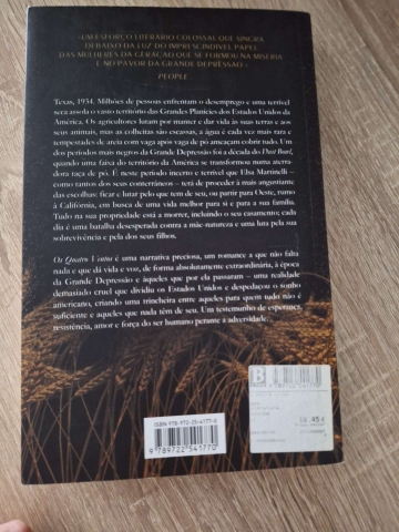 Os Quatro Ventos é uma narrativa preciosa, um romance a que não falta nada, que dá vida e voz, de forma absolutamente extraordinária, à época da Grande Depressão e àqueles que por ela passaram - uma realidade demasiado cruel que dividiu os Estados Unidos e rasgou o sonho americano, criando uma trincheira entre aqueles para quem tudo não é suficiente e aqueles que nada têm de seu. Um testemunho de esperança, resistência, amor e da força do ser humano perante a adversidade.
