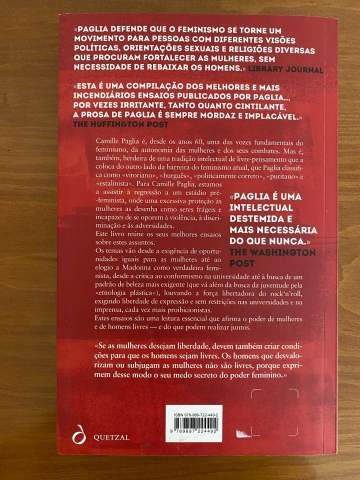 Camille Paglia é, desde os anos 60, uma das vozes fundamentais do feminismo, da autonomia das mulheres e dos seus combates. Mas é, também, herdeira de uma tradição intelectual de livre- -pensamento que a coloca do outro lado da barreira do feminismo atual, que Paglia classifica como «vitoriano», «burguês», «politicamente correto», «puritano» e «estalinista». Para Camille Paglia, estamos a assistir à regressão a um estádio pré-feminista, onde uma excessiva proteção às mulheres as desenha como seres frágeis e incapazes de se oporem à violência, à discriminação e às adversidades.