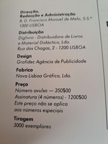 Revista em muito boas condições. Esgotado nas livrarias. Tiragem limitada a 3000 exemplares. Envio grátis em correio editorial normal. Envio em correio registado acresce 2,40 euros. Se tiver alguma dúvida não hesite em perguntar.