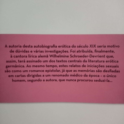 A autoria desta autobiografia erótica do século XIX seria motivo de dúvidas e várias investigações. Foi atribuída, finalmente, à cantora lírica alemã Wilhelmine Schroeder-Devrient que, assim, terá assinado um dos textos centrais da literatura erótica germânica. Ao mesmo tempo, estes relatos de iniciações sexuais são como um romance epistolar, já que as memórias são desfiadas em cartas dirigidas a um renomado médico da época - o único homem, segundo a autora, que nunca procurou seduzi-la...