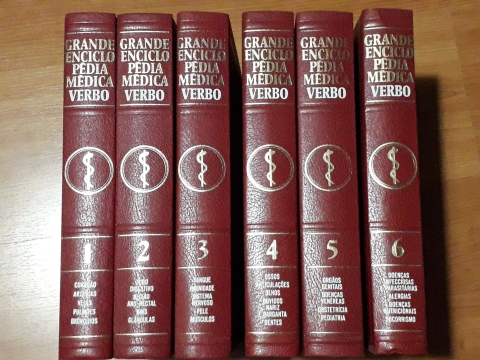 Enciclopédia Médica da Verbo em 6 volumes, encadernados em couro sintético e debruados a doirado.