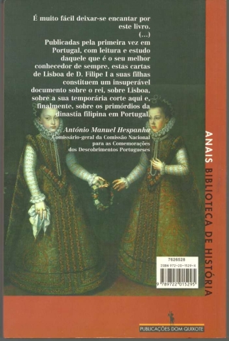 CARTAS PARA DUAS INFANTAS MENINAS. Portugal na Correspondência de D. Filipe I para Suas Filhas (1581-1583). *** Organização, introdução e notas de Fernando Bouza Álvarez *** Apresentação de António Hespanha *** Tradução de Nuno Senos *** Revisão Científica de Pedro Cardim *** Lisboa: Publicações Dom Quixote [Coedição com a Comissão Nacional para as Comemorações dos Descobrimentos Portugueses], 1999. Colecção: Anais | Biblioteca de História – 28. (23,5 x 15,5 cm.) com 222 + [2] pp. Capa flexível, com badanas. Bom exemplar. Capa com marcas de manuseamento, vincos discretos e um leve desgaste nas margens, encontrando-se ainda, de um modo geral, em bom estado e limpa. Páginas bem conservadas e limpas. *** Primeira edição portuguesa das cartas de D. Filipe I a suas filhas, feita com base na leitura e transcrição dos originais autógrafos, que constituem um insuperável documento sobre o rei, sobre Lisboa, sobre a sua temporária corte em terra portuguesa e, finalmente, sobre os primórdios da dinastia filipina em Portugal. «Protagonista da crise sucessória que atingiu a Coroa portuguesa em 1580, o rei Filipe II de Espanha, I de Portugal, passou quase dois anos em terras lusitanas, e durante essa estadia escreveu trinta e duas cartas às suas filhas Isabel Clara Eugénia e Catarina Micaela, as quais se encontravam em Madrid. Estas três dezenas de cartas, redigidas entre Abril de 1581 e Fevereiro de 1583, são agora publicadas pela primeira vez em versão portuguesa. Repletas de detalhes acerca da relação entre D. Filipe e as infantas suas filhas, estas cartas transmitem uma imagem muito familiar e intimista do rei. Observador atento da realidade portuguesa, D. Filipe registou tudo o que sentiu ao visitar as cidades e as vilas portuguesas, e ao contactar com as suas gentes e com os seus costumes. Por isso, estas cartas familiares constituem um documento fundamental para conhecermos a cultura, a política e a sociedade de finais de Quinhentos.» (Índice nas imagens 3 e 4). *** Portes: envio gratuito em correio normal (tarifa especial para livros) * envio em correio registado: 1,70
