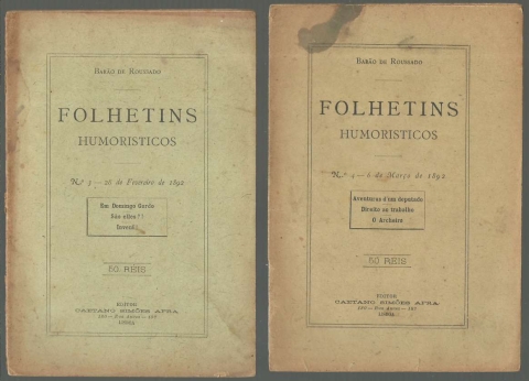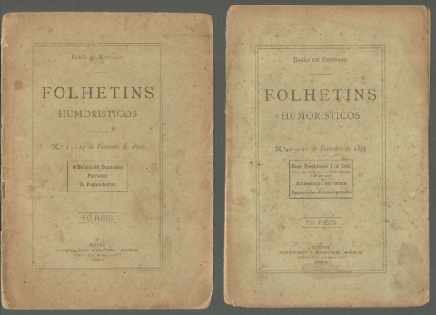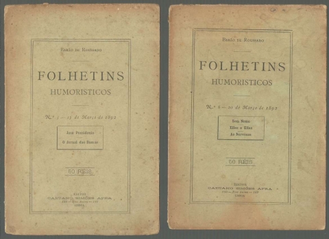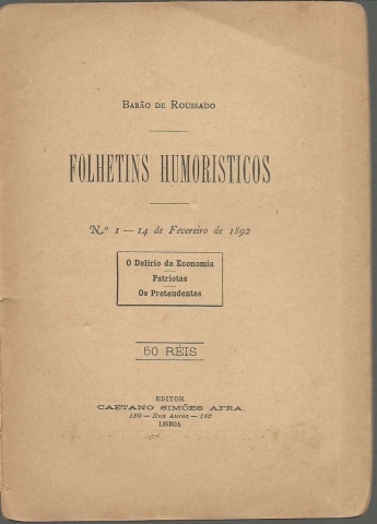 FOLHETINS HUMORÍSTICOS. N.º 1 – 14 de Fevereiro de 1892. O Delirio da economia. Patriotas. Pretendentes. | N.º 2 – 21 de Fevereiro de 1892. Dom Possidonio I (O Crú) Ou o que ha de ser o mundo reduzido a 50 por cento. Archeologia do Futuro. Impressões de um deputado. | N.º 3 – 28 de Fevereiro de 1892. Em Domingo Gordo. São elles?! Inveni! | N.º 4 – 6 de Março de 1892. Aventuras d’um deputado. Direito ao trabalho. O Archeiro. | N.º 5 – 13 de Março de 1892. José Possidonio. O Jornal das Damas. | N.º 6 – 20 de Março de 1892. Sem Nome. Elles e Ellas. As Nervosas. *** Barão de Roussado *** Lisboa: Editor Caetano Simões Afra, 1892. (Companhia Typographica – Lisboa). 6 opúsculos (18,5 x 12,5 cm. aprox.) com 29 + [3] pp., 32 pp., 30 + [2] pp., 29 + [3] pp., 32 pp. e 31 + [1] pp. Capas flexíveis. Exemplares razoáveis. Capas envelhecidas, com evidentes marcas de uso, manchadas e gastas nas margens e nas lombadas, onde apresentam mesmo alguns rasgões e a falta de pedacinhos de papel. Apesar de, globalmente, se apresentarem um pouco cansadas e não muito limpas, estão ainda apresentáveis. Páginas em relativo bom estado, embora se encontrem amarelecidas e apresentem algumas manchas, que variam de livro para livro, mas que, de um modo geral, não impactam significativamente o aspecto geral. Algumas folhas apresentam também pequenos rasgões ou a falta de pedacinhos de papel nas margens, mas tudo de pequena importância e devido sobretudo à fraca qualidade do papel que, tal como o das capas, é de grande fragilidade. Todos os livros apresentam uma etiqueta de livraria colada na primeira página. *** Primeira edição dos seis primeiros Folhetins Humorísticos do Barão de Roussado, publicação semanal de que, julgo, apenas se publicaram nove fascículos, entre 14 de Fevereiro de 1892 e 14 de Maio de 1892, embora neste último se anunciasse o décimo folhetim, que encerraria a série. Como o título indica os folhetins são constituídos por histórias de fundo humorístico, que constituem também, muitas vezes, sátiras à vida social e política portuguesa de finais do século XIX. Nos dois últimos números colaborou também Eduardo Vidal e no penúltimo M. Pinheiro Chagas. Publicação invulgar, já muito difícil de reunir. *** Portes: envio gratuito em correio normal (tarifa especial para livros) * envio em correio registado: 1,70