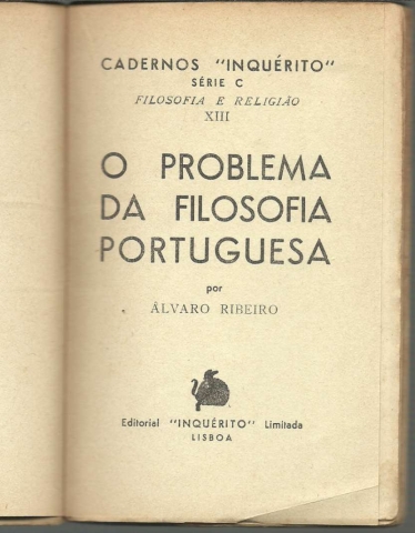 O PROBLEMA DA FILOSOFIA PORTUGUESA. *** Álvaro Ribeiro *** Lisboa: Editorial “Inquérito” Limitada, 1943. Colecção: Cadernos “Inquérito” – 83; Série C; Filosofia e Religião – XIII. (19 x 12 cm.) com 74 + [6] pp. Capa flexível. Exemplar razoável. capa com marcas de manuseamento, manchas, vincos e um pouco gasta e amachucada nas margens e na lombada, que apresentam também pequenos rasgões. Apesar de envelhecida e não muito limpa, de um modo geral, está ainda apresentável. Páginas globalmente bem conservadas e limpas, embora apresentem um tom amarelecido e algumas manchas, tudo devido, em grande medida, à qualidade do papel. *** Primeira edição daquele que é, segundo julgo, o primeiro livro publicado pelo filósofo portuense Álvaro Ribeiro, e que desde logo se afirmou como uma das suas obras de referência, onde o Autor, reflectindo sobre um problema sempre debatido, manifesta a sua esperança e fé na viabilidade de uma filosofia portuguesa que exprima, especulativamente, as qualidades próprias, intrínsecas do povo português. *** Portes: envio gratuito em correio normal (tarifa especial para livros) * envio em correio registado: 1,70