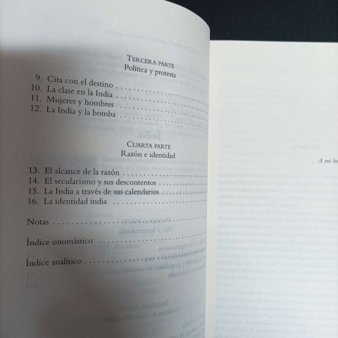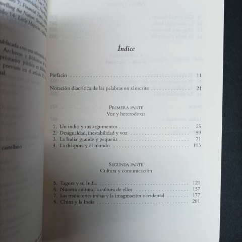 Sen, en esta serie de ensayos fundamentales, reflexiona sobre los mitos imaginarios que aún tergiversan la aproximación occidental a la realidad de este país, que obvian la importancia de su tradición dialógica, de sus usos heterodoxos, seculares y democráticos, de sus prácticas intelectuales y científicas y de la exigencia del juicio razonado como integrantes de la identidad india. En definitiva, este libro de Amartya Sen nos aproxima a una India contemporánea que, en su riquísima complejidad, aún reutiliza y reasume los logros culturales del pasado.