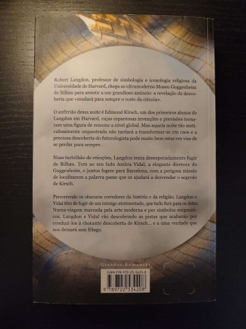 Numa viagem marcada pela arte moderna e por símbolos enigmáticos, Langdon e Vidal vão descobrindo as pistas que acabarão por conduzi-los à chocante descoberta de Kirsch… e a uma verdade que até então nos tem escapado e que nos deixará sem fôlego.