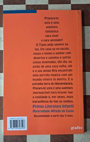 O Tiago anda sempre na lua. Em casa ou na escola, passa o tempo a sonhar com desertos e camelos e outras coisas inventadas. Um dia, no sotão de uma casa velha, ele e a sua amiga Rita encontram uma garrafa mágica com um mundo inteiro lá dentro. É a estranha terra de Alupapulapara. Prepara-te: esta é uma aventura inesquecível para provar que a realidade é, por vezes, mais maravilhosa do que os sonhos.
