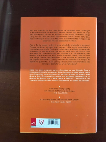 Neste tão aguardado regresso, John Green, autor premiado de A Culpa É Das Estrelas e À Procura de Alaska conta, com dolorosa intensidade, a história de Aza, numa tentativa de partilhar connosco os dramas da doença que o afeta desde a infância. O resultado é um romance brilhante sobre o amor, a resiliência, e o poder da amizade.