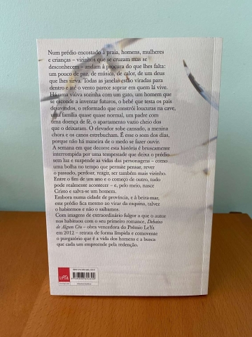 Num prédio encostado à praia, homens, mulheres e crianças - vizinhos que se cruzam mas se desconhecem - andam à procura do que lhes falta: um pouco de paz, de música, de calor, de um deus que lhes sirva. Todas as janelas estão viradas para dentro e até o vento parece soprar em quem lá vive. Há uma viúva sozinha com um gato, um homem que se esconde a inventar futuros, o bebé que testa os pais desavindos, o reformado que constrói loucuras na cave, uma família quase quase normal, um padre com uma doença de fé, o apartamento vazio cheio dos que o deixaram. O elevador sobe cansado, a menina chora e os canos estrebucham. É esse o som dos dias, porque não há maneira de o medo se fazer ouvir.