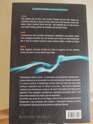 Fascinada por Adele e David - o casal ideal, aparentemente irrepreensível -, Louise acaba por se ir envolvendo na intrincada teia que é aquele casamento. E, a pouco e pouco, à medida que penetra cada vez mais nas suas vidas, começa a descobrir que há falhas entre eles... Será David realmente o homem que ela pensava conhecer bem? Será Adele tão frágil quanto aparenta? que segredos inquietantes e perigosos escondem eles? E até onde serão capazes de chegar para os esconder? Um thriller que se lê de um só fôlego, com um final surpreendentemente inesperado, e que reinventa com mestria o tradicional triângulo amoroso.