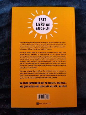 A promessa é de Joana Marques, humorista, locutora de rádio, guionista, e desiludida com livros de auto-ajuda. Por isso resolveu escrever um livro de anti-ajuda. Sim, leu bem, tem entre mãos o primeiro (e provavelmente o último) livro de anti-ajuda do mundo.