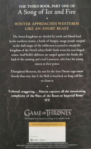 The Seven Kingdoms are divided by revolt and blood feud. In the northern wastes, a horde of hungry, savage people steeped in the dark magic of the wilderness is poised to invade the Kingdom of the North where Robb Stark wears his new-forged crown. And Robb’s defences are ranged against the South, the land of the cunning and cruel Lannisters, who have his younger sisters in their power.