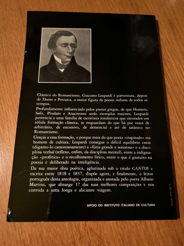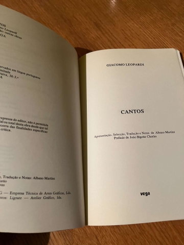 Canti (Cantos), palavra que Giacomo Leopardi escolheu para intitular sua coleção de poemas. O título "Canti" apareceu, pela primeira vez, na edição fiorentina de 1831 -precedida por uma dedicatória "Agli amici di Toscana" (Aos amigos de Toscana).