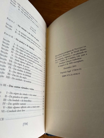 O título completo da obra é A Treatise of Human Nature: Being an Attempt to introduce the experimental Method of Reasoning into Moral Subjects (Tratado da Natureza Humana: Uma Tentativa de Introduzir o Método Experimental de Raciocínio nos Assuntos Morais). É dividia nas seguintes sessões: