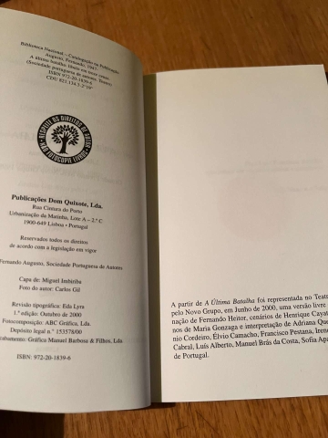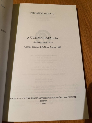 Grande Prémio de Teatro Português SPA/Novo Grupo 1999[1] Editada pela SPA/D. Quixote em 2000 Encenada por Fernando Heitor no Teatro Aberto em 2000
