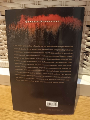 A vida parece quase perfeita a Travis Parker, um veterinário de uma pequena cidade costeira da Carolina do Norte que a sorte presenteou com uma profissão gratificante, bons amigos e uma casa com jardim à beira-mar. Os dias sucedem-se a um ritmo aprazível, pautado por passeios de barco e barbecues com os amigos de sempre. Nada faria prever que alguém pudesse vir desinstalá-lo do seu quotidiano confortável, mas o destino consegue ser imprevisível, e um dia Travis conhece a sua nova vizinha Gaby Holland. O primeiro encontro não podia ser menos auspicioso, mas o amor move-se por caminhos improváveis, e a paixão entre os dois torna-se inevitável. No entanto, para Travis, este romance reserva uma escolha difícil, talvez a mais difícil que um homem apaixonado pode ter de fazer... afinal, até onde podemos ir em nome do verdadeiro amor? Nicholas Sparks continua a ser o contador de histórias mais acarinhado pelo público norte-americano e um dos autores de ficção mais vendidos em todo o mundo. "Uma escolha por amor" faz-nos compreender, uma vez mais, porquê.