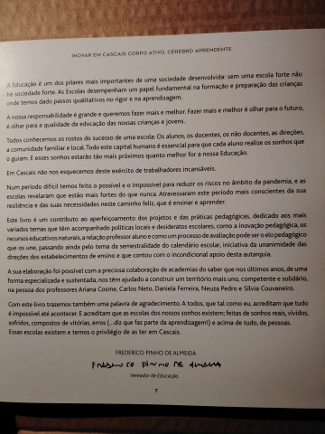 Este livro é um contributo ao aperfeiçoamento dos projetos e das práticas pedagógicas, dedicado aos mais variados temas que têm acompanhado políticas locais e desideratos escolares, como a inovação pedagógica, os recursos educativos naturais, a relação professor aluno e como um processo de avaliação pode ser o elo pedagógico que os une, passando ainda pelo tema da semestralidade do calendário escolar, iniciativa da unanimidade das direções dos estabelecimentos de ensino.