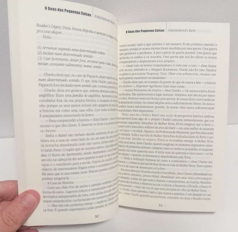 O Deus das Pequenas Coisas é a história de três gerações de uma família da região de Kerala, no sul da Índia, que se dispersa por todo o mundo e se reencontra na sua terra natal. Uma história feita de muitas histórias. A história dos gémeos Estha e Rahel, nascidos em 1962, por entre notícias de uma guerra perdida. A de sua mãe Ammu, que ama de noite o homem que os filhos amam de dia, e de Velutha, o intocável deus das pequenas coisas. A da avó Mammachi, a matriarca cujo corpo guarda cicatrizes da violência de Pappachi. A do tio Chacko, que anseia pela visita da ex-mulher inglesa, Margaret, e da filha de ambos, Sophie Mol. A da sua tia-avó mais nova, Baby Kochamma, resignada a adiar para a eternidade o seu amor terreno pelo Padre Mulligan. Estas são as pequenas histórias de uma família que vive numa época conturbada e de um país cuja essência parece eterna. Onde só as pequenas coisas são ditas e as grandes coisas permanecem por dizer. O Deus das Pequenos Coisas é uma apaixonante saga familiar que, pelos seus rasgos de realismo mágico, levou a crítica a comparar Arundhati Roy com Salmon Rushdie e García Márquez, e lhe valeu o Booker Prize.