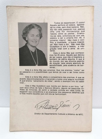 Esta é a dona Maj que conhecemos há 25 anos. Aquela que deixou de ser sueca, que não é brasileira e também de pátria alguma. A que é do mundo, por seu enorme espírito de doação, pela ampla abertura de sensibilidade, pela ausência de barreiras...