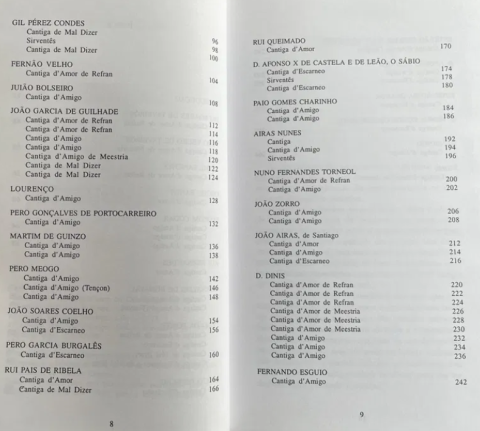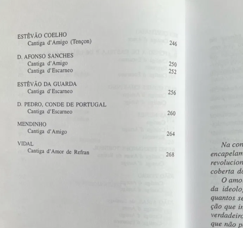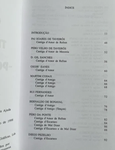 Esta breve colectânea reúne os primeiros e tími-dos passos num trabalho de proporções mais ambiciosas que abrange outros poetas importantes ausentes destas páginas, restrição que nos foi imposta não só pela economia do presente volume como pela morosidade de uma tarefa que está longe de ter dado todos os seus frutos. Trata-se, portanto, de um excurso selectivo nos Cancioneiros, que de modo algum esgota as preciosidades aí reclusas."