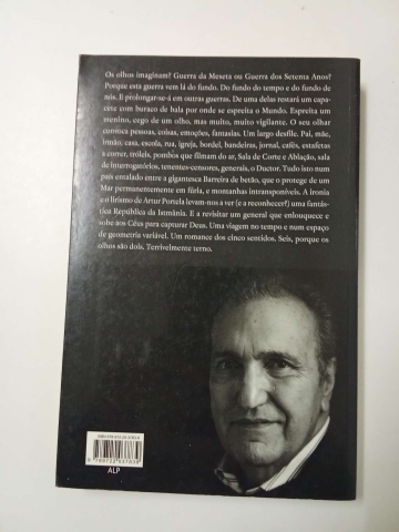 Um livro irónico e terrivelmente terno. Os olhos imaginam? Guerra da Meseta ou Guerra dos Setenta Anos? Porque esta guerra vem lá do fundo. Do fundo do tempo e do fundo de nós. E prolongar-se-á em outras guerras. De uma delas restará um capacete com buraco de bala por onde se espreita o Mundo. Espreita um menino, cego de um olho, mas muito, muito vigilante. O seu olhar convoca pessoas, coisas, emoções, fantasias. Um largo desfile. Pai, mãe, irmão, casa, escola, rua, igreja, bordel, bandeiras, jornal, cafés, estafetas a correr, tróleis, pombos que filmam do ar, Sala de Corte e Ablação, sala de interrogatórios, tenentes-censores, generais, o Ductor. Tudo isto num país entalado entre a gigantesca Barreira de betão, que o protege de um Mar permanentemente em fúria, e montanhas intransponíveis. A ironia e o lirismo de Artur Portela levam-nos a ver (e a reconhecer?) uma fantástica República da Istmânia. E a revisitar um general que enlouquece e sobe aos Céus para capturar Deus. Uma viagem no tempo e num espaço de geometria variável. Um romance dos cinco sentidos. Seis, porque os olhos são dois. Terrivelmente terno.