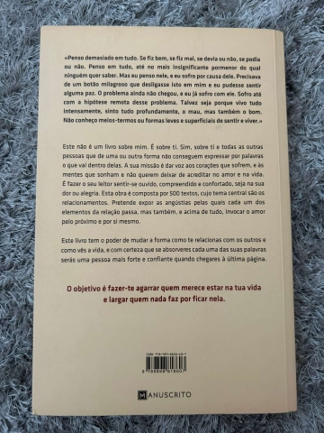 Este livro é composto por 500 textos com os relacionamentos como tema central. Pretende expor as angústias pelas quais todos passamos mas também, e acima de tudo, invocar o amor pelo próximo e por si mesmo. Este livro tem o poder de mudar a forma como nos relacionamos com os outros e como encaramos a vida. Quem absorver cada uma das suas palavras será uma pessoa mais forte e confiante quando chegar à última página.